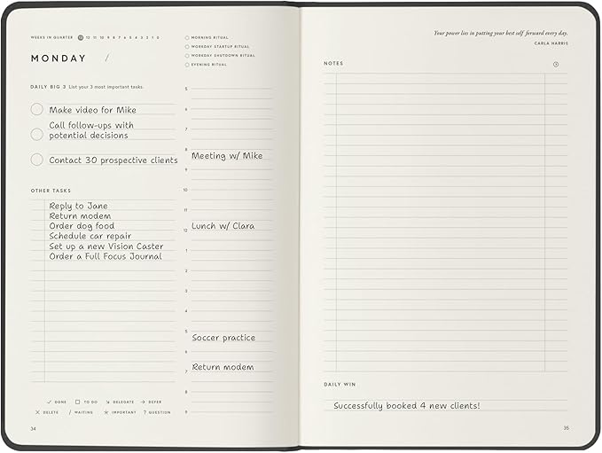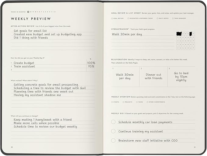 - 📈 TRACK YOUR PROGRESS & STAY FOCUSED – Utilize the weekly and quarterly review templates, alongside daily task lists, to seamlessly bridge the gap between your everyday actions and your long-term ambitions. With your priorities consistently in sight, you won’t be derailed by life’s daily demands. The Full Focus Planner empowers you to filter through the noise of the urgent and focus on what truly matters, ensuring steady progress toward your most important goals.