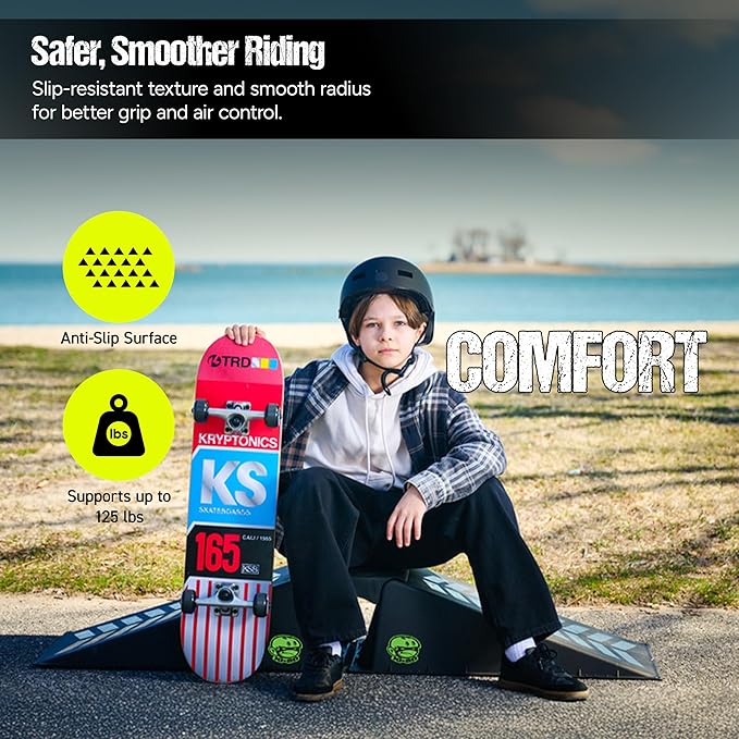 - Beginner-Friendly Launch Ramp for Kids: Designed as the perfect skateboard ramp for kids, this beginner-friendly set helps young riders build confidence with smooth transitions and low-impact landings. Great for first-time users learning tricks on scooters, BMX bikes, inline skates, and skateboards in a safe, low-height setup.