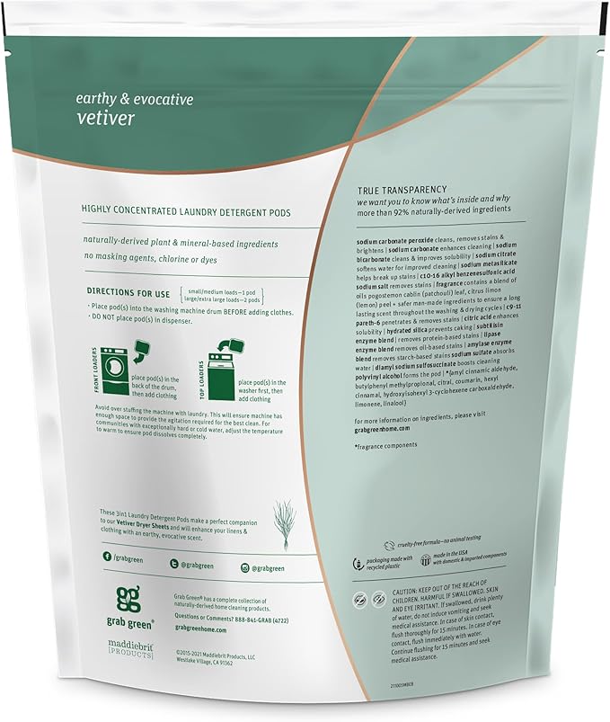- Contains: 1- 60 Pod Bag of Grab Green Natural Vetiver 3in1 Laundry Detergent Pods. Our velcro closure bags are convenient and easy to use, no hassling with frustrating zip closures