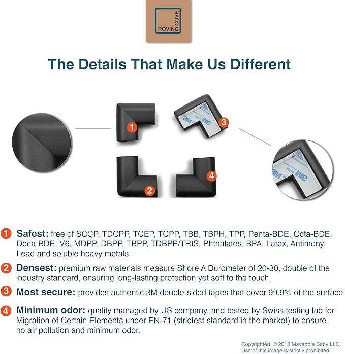 - CLEAN SAFETY: Roving Cove uses safe and pure raw material and was the first brand to make foam safety bumpers without the use of toxic flame-retardant chemicals (SCCPs). Our corner protector contains no BPA, no phthalates, no heavy metals, no latex, no SCCPs. Inherently flame-resistant; passed flammability tests under US regulations.