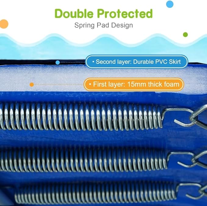 - 【Premium Quality Materials for Max Safety】Galvanized rust resistant springs(7 inch) offer impressive bounce. Anti-UV jumping mat (made of PP) provides more weight capacity. 6ft higher enclosure net (made of environmental PE) ensures absolute safety and fastness when jumping. And the poles are padded with 10mm foam, can protect your kids from banging against the steel pole.