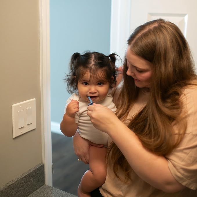 - CONVENIENT COUNTERTOP STORAGE. The elephant ears let baby set the brush down without surface contact or the wide base lets you securely store it upright.