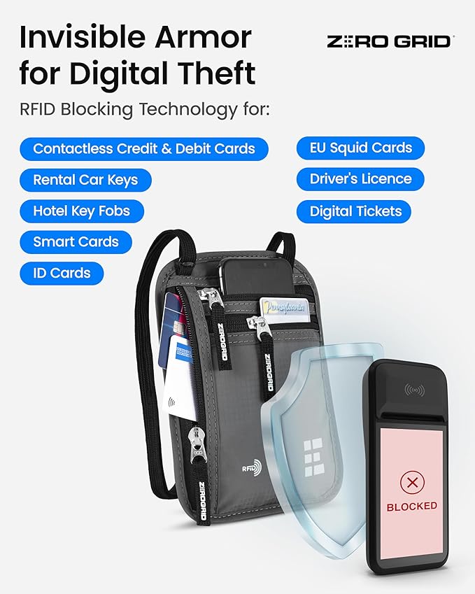 - Protect Your Personal Data: Equipped with advanced RFID blocking technology, this travel pouch shields your sensitive information from digital theft. Keep your credit cards, passports, and personal data secure from electronic pickpockets, so you can travel with confidence.