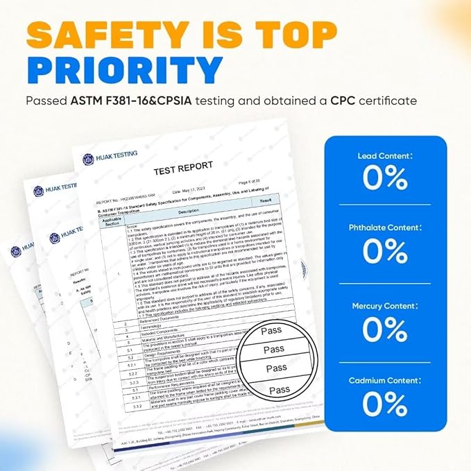 - 【Safety is Top Priority】Experience peace of mind with the ORCC Trampoline, now boasting CPC certification in the USA, rigorously tested under CPSIA guidelines. Meanwhile, our trampoline, tested to ASTM F381-16 specifications, ensures a structure that excels in firmness, and UV protection, exceeding industry standards and providing a safe, durable option for endless fun.