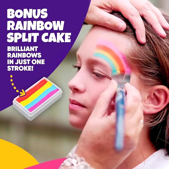 - 🎨 𝗖𝗢𝗠𝗣𝗟𝗘𝗧𝗘 𝗙𝗔𝗖𝗘 𝗣𝗔𝗜𝗡𝗧 𝗞𝗜𝗧: Unleash creativity with 28 vibrant color face painting kit for kids, 24 reusable stencils, 100 gem stickers, 2 body glitter pots, 3 brushes, 4 sponges, & a 16-design booklet & bonus rainbow split cake - fun for the whole family! A fun Halloween face paint kit with stencils and Halloween face paint kit for adults. Please note: Packaging may vary