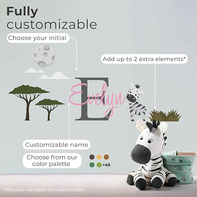 Personalized Name Jungle Animals Vinyl Wall Decor I Nursery Wall Decal for Baby Boy & Girl Decoration I Stickers for Kids I Multiple Sizes (E. Zebra)