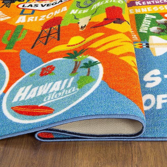 - BRING U.S. GEOGRAPHY TO LIFE: Explore all 50 states, Washington D.C., and bordering countries like Mexico and Canada with this colorful USA map rug. Includes landmarks like Mount Rushmore and the Mississippi River.