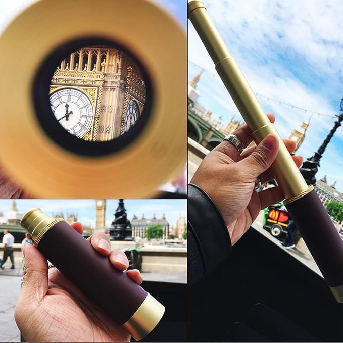 - [MATERIAL]: The main components are of high quality aluminum alloy plating gold while the hand-held part is covered with high quality leather.Elegant appearance! The handheld monocular telescope is designed with durable metal construction and shiny brass finish.