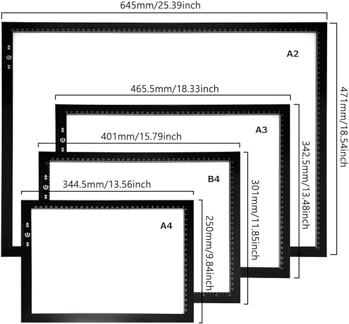 Easy Carrying -- A3 Size Super Slim Trace Drawing light box with 0.23’’ Aluminum Frame is Sturdy, Light Guide Board make The illumination is perfectly even, super bright, and flicker-free, Overall dimension including Black Frame: 18.33”x 13.48”, Visual area: 16.7” x 11.9”