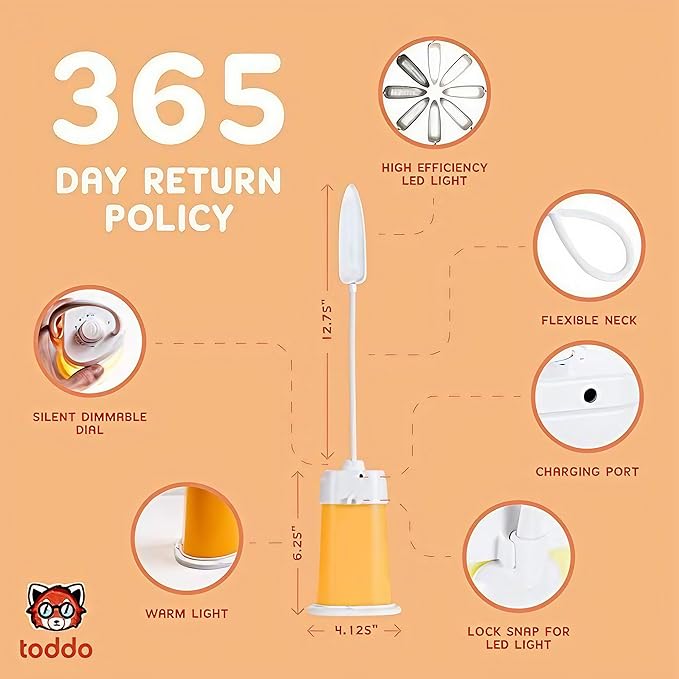 - SILENT LANTERN LIGHT FOR BEDROOM SLEEP - Even the best night lights for kids are often ruined by thoughtless design flaws, such as flickering lights and loud switches that wake your little ones. The Toddo Kids Bedtime Reading Light features a non-flickering LED light and whisper-silent, smooth-turning dimmer knob, so there’s no loud clicking or irritating flashing. And with its USB-rechargeable battery, our kids reading light lantern lasts 6–12 hours so kids won't wake up scared.