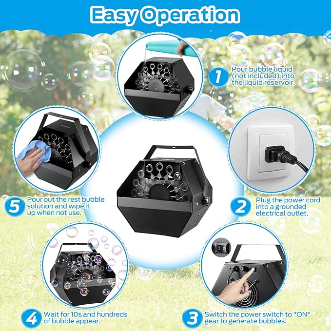- Easy to Be Used in Manual: Just set the bubble machine for toddlers on an even surface, fill the tank with bubbles solution, switch the power on/off switch to "ON" gear, then this bubble machine for kids will start to work automatically, it is simple and easy to operate for all ages.The best ratio of bubble liquid is: bubble oil: water = 1:13 (Not Included)