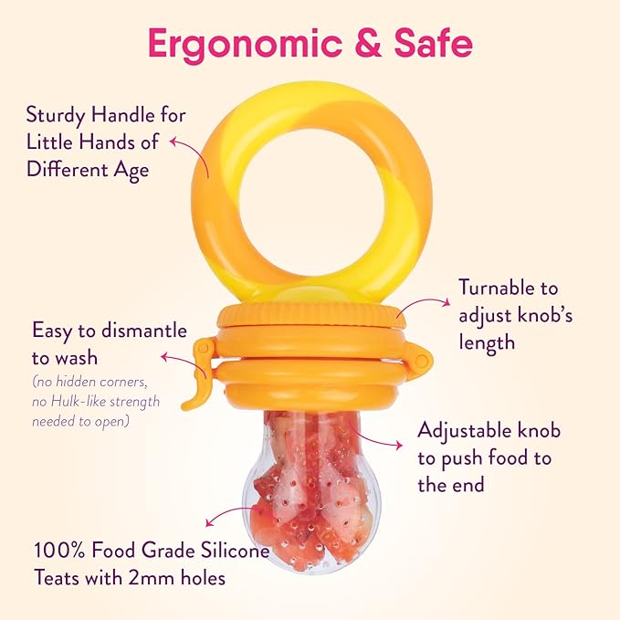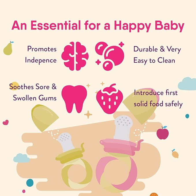 - ★ MOST VALUE FOR MONEY BABY FRUIT / FOOD FEEDERS & TEETHERS (2 PCS w 4 Silicone Teats) – NatureBond Baby Fruit Feeders and Teethers are designed in "APPETIZING" candy-like colors that stimulate baby’s appetite for consumption of natural nutrients from fruits and vegetables. It is also a safe way to introduce our little ones to solid food while they go through weaning and teething phase. The All-IN-1 feeder can also soothe baby's teething discomfort by massaging the gums through chewing.