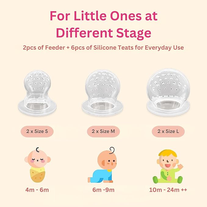 - ★ ALL SIZES INCLUDED – 2 x Feeders and Bonus pack of 4 silicone sacs / teats for different ages of baby/toddlers. (2 Large Sizes Sacs are pre-packed with Feeders. Additional 2 Small Sizes and 2 Medium Size included for parents to have more options). We value you and your baby's comfort and convenience. Unlike other feeders which do not provide different sizes, we recommend customers to use an appropriate size for your little ones.