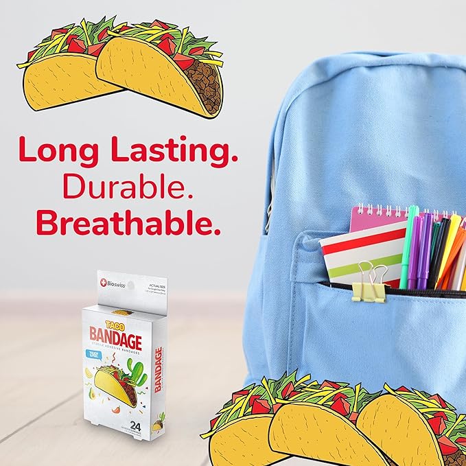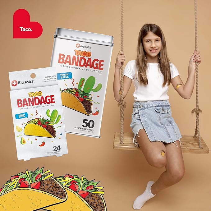 TACO BANDAGES: This 24 piece pack of adorable and delicious looking taco bandages is great for putting a smile on kids' faces while protecting wounds such as cuts, scrapes, and burns; sticky bandages are perfect for kids and adults alike, and also for school nurses and pediatric doctors