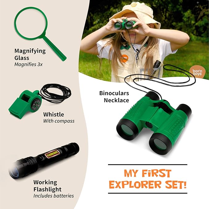 EXCELLENT QUALITY: Our toy explorer kit for girls & boys exploration set has the highest quality & has the safety standards you deserve. This kids outdoor explorer kit with backyard safari hat, also comes with washable vest, binoculars, scavenger hunt, pencil, magnifying glass, flashlight which includes batteries, whistle w/ compass and storage bag for your bug kit or bug collection kit for kids