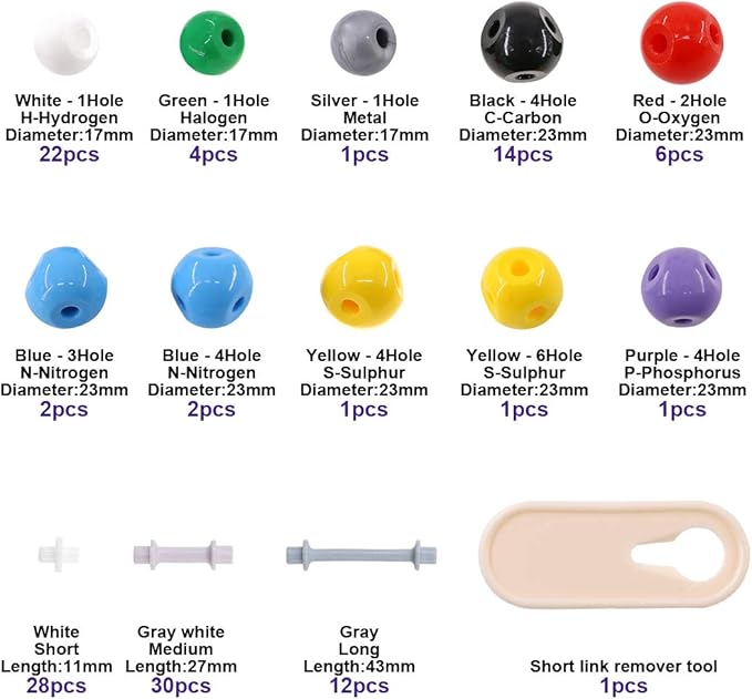 - ★ MOLECULE SCIENCE IN 3D --- We have prepared 125 Pcs molecular model set for you, This model contains C, H, O, N, P, S, Halogen, and other metals and a variety of single and double bonds, long bonds, long keys. Can be put high school, university chemistry in most of the organic or inorganic molecular structure model for the study of experimental operation.