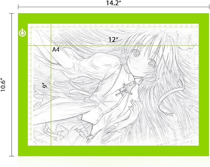 EASY CARRYING -- Light weight super slim light pad, thickness only 0.2’’, about 5mm. Overall dimension including black frame is L14.2’’xW10.6’’xH0.2’’. The visual working area is 9’’x12’’.