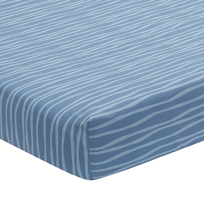 Two baby/toddler fitted crib sheets are included, one is a breathable 100% Cotton tossed dino print on a white ground and the other is a blue blended fabric with wavy lines.