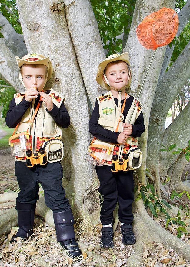 - 🐌 Each kit is durable, high quality and includes, Toy BINOCULARS, Safari/Hunting VEST with bright Jungle pattern, HAT with quick release to prevent choking. Great for dress up, pretend play, wildlife and nature exploration. The perfect Christmas gift!