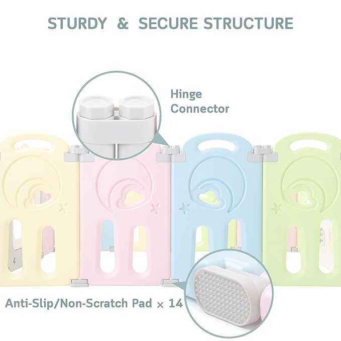 STURDY & SECURE: Keeps its shape and position thanks to its strong hinge connectors and anti-slip pads; includes a gate with safety lock that allows convenient access and secures your baby inside.