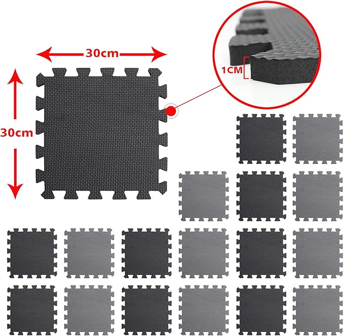 Cover area: 86CM x 170CM( Β±1CM) / approx. 1.46 SQ. M,one sets 18pcs,(300mm x 300mm x 10mm). Package includes 9 BLACK and 9GRAY interlocking foam tiles, making it a perfect workout and training accessory.