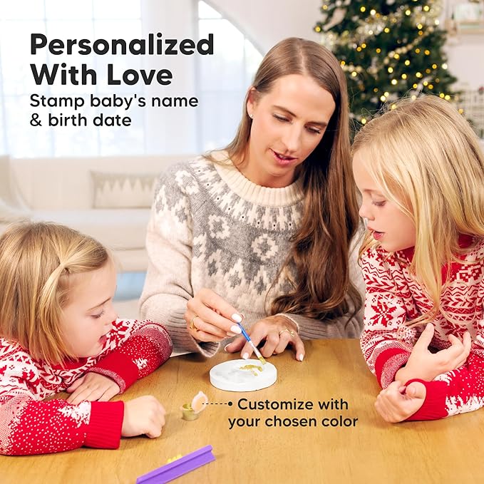 - Personalized Baby Print Ornament Maker - This baby clay handprint kit comes with bonus acrylic paint, paint brush, 6 satin ribbons, 2 twig strings and alphabet stamps. Create a special and memorable baby's first Christmas ornament for your little one!