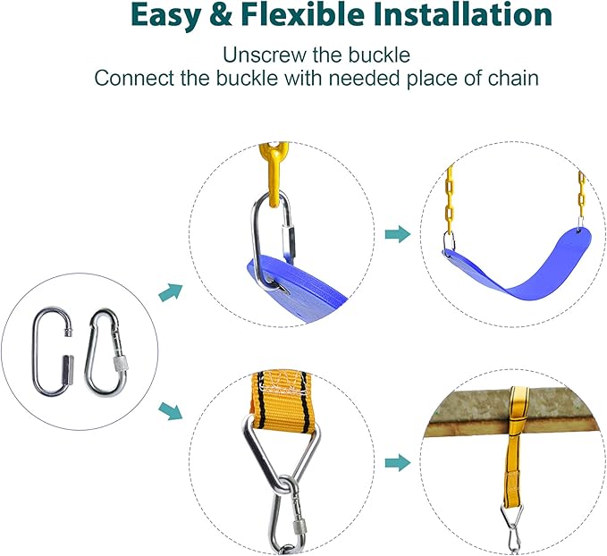 - 【Easy Installation & More Flesible Design】Our swing seats with chains provide extra locking buckles that are made of premium steel, which are steady and durable. The material solves the problem of rust on product surface. You can connect the buckle with the chain in the needed link, which makes the hanging installation more flexible. Unlike other kids swings' plastic plate connection buckle, our child swing seat connects with locking buckle that can easily take down for convenience.