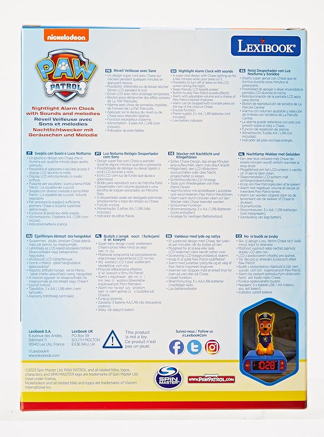 - Alarm with adjustable volume and a choice of Paw Patrol inspired ringtones. Perfect to wake up smoothly.