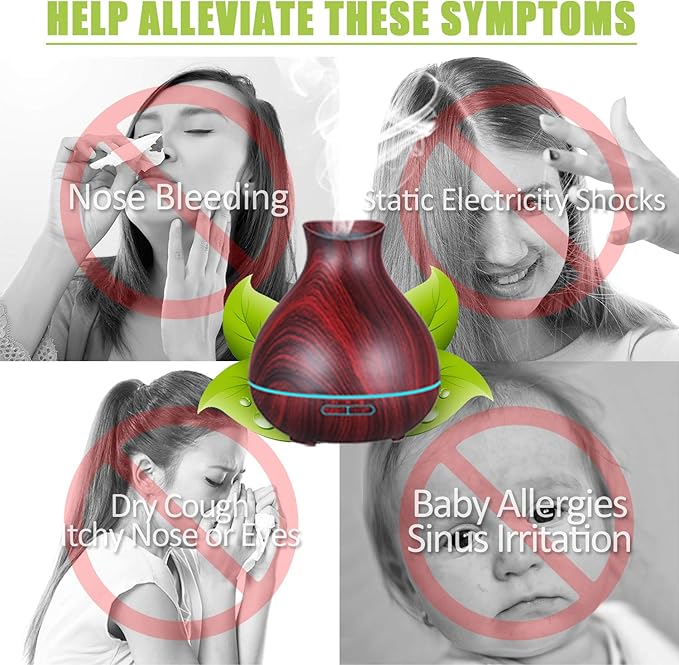 - REDUCE DRY CLIMATE IN WINTER: This aromatherapy diffuser helps to alleviate winter dryness by increasing air humidity. It improves breathing and sleep and reduces static shock in dry climates. Some essential oils can produce a healing effect that relieves your sinuses and can help you breathe better when you use an air conditioner. A great gift for yourself, parents, friends, and partners.