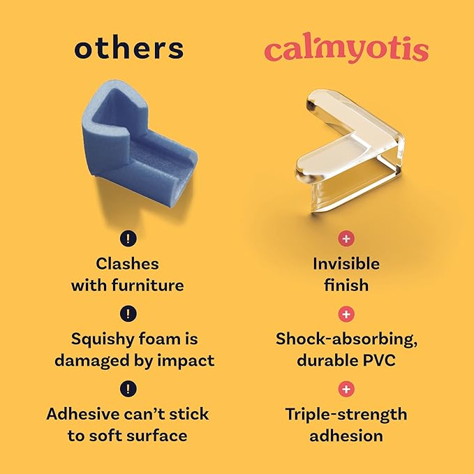 - Optimal Density: Other corner protectors are made from too-soft silicone or foam, marketed as being desirably “squishy”. But adhesives don’t stick well to soft materials, so little hands can tug them off easily. Our premium PVC protects while softer alternatives can dent inwards or flake off over time.