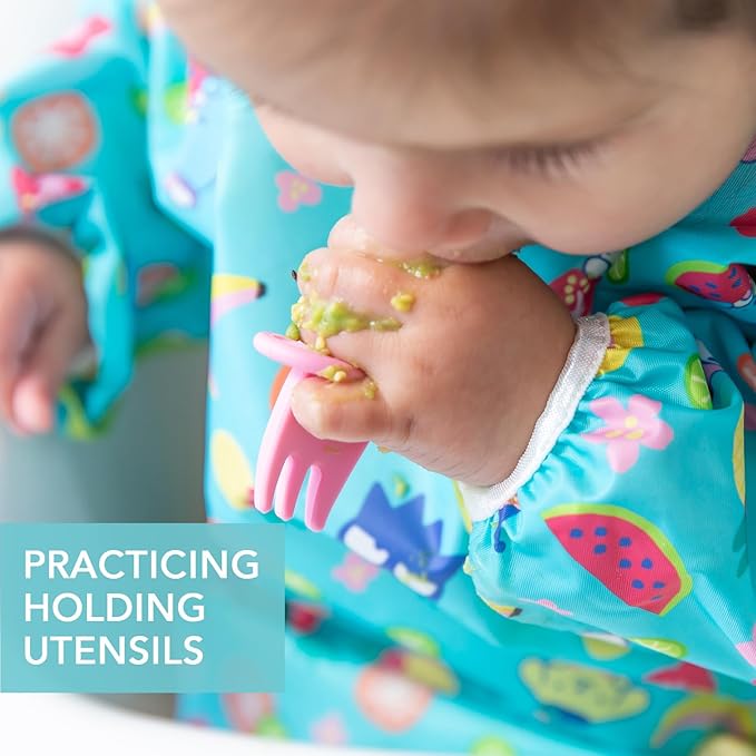 - BABY UTENSILS – Spoon set intended for Stage 1 of baby led weaning – introducing babies to the concept of holding utensils; practice dipping into purees at the early part of BLW; for ages 6 months up before they have a firm grasp on self-feeding; the fork and spoon are best for dipping and scooping, not yet spearing / piercing solid foods