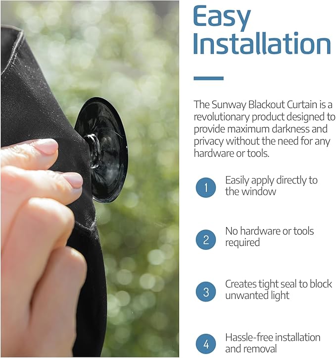 PORTABLE STICK-ON BLACKOUT BLIND – Easily blackout any rooms windows no matter where you are! The SUN AWAY portable blackout curtain features durable suction cups, making it great when traveling or as a temporary window cover -- Large size of 66"L x 51”W