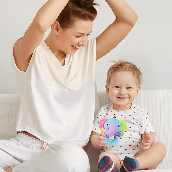 CUTE DESIGN -- Lovely animal image design,the ears of elephant and the wing of owl were with sound paper, encourage baby to reach and grab.The Soft rattles have bells inside, it make “ling,ling...” sounds when shaking the dolls.