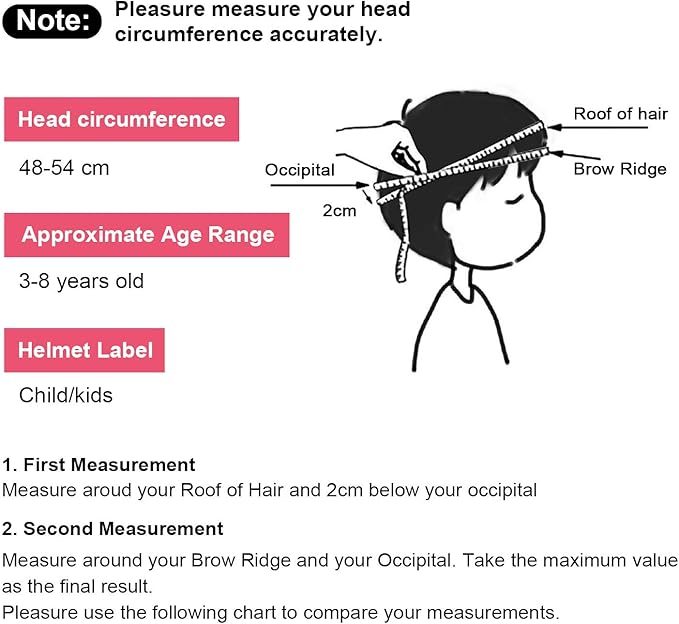 [Kids Helmet] It is suitable for kids aged 3–8 years. The helmet size is 48–54 cm/18.9– 21.3 inches and easily adjustable for a snug fit; it could grow with your child for a few years