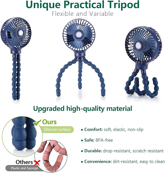 - 【Upgraded Flexible Unbreakable Tripod】snawowo baby stroller fan has an upgraded tripod which is made of high quality bendable metal and food grade silicone surface instead of the old plastic and sponge surface. so you don't have to worry about the baby eating it by mistake. The tripod is waterproof, not easy to get dirty and broken, easy to clean, and more anti-wear.