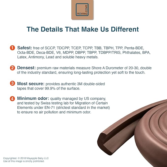 - CLEAN SAFETY: Roving Cove uses safe and pure raw material and was the first brand to make foam safety bumpers without the use of toxic flame-retardant chemicals (SCCPs). Our edge protector cushion contains no BPA, no phthalates, no heavy metals, no latex, no SCCPs. Inherently flame-resistant; passed flammability tests under US regulations.