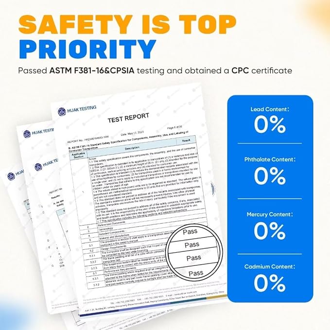 - 【Safety is Top Priority】Experience peace of mind with the ORCC Trampoline, now boasting CPC certification in the USA, rigorously tested under CPSIA guidelines. Meanwhile, our trampoline, tested to ASTM F381-16 specifications, ensures a structure that excels in firmness, antirust, and UV protection, exceeding industry standards and providing a safe, durable option for endless fun.