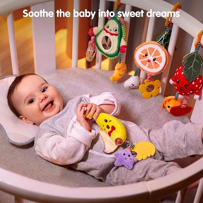 TUMAMA Baby Toys for 3 6 9 12 Months,Hanging Fruit Rattles Avocado,Banana,Orange and Strawberry,Stroller Mobile Toys,Plush Soft Rattles for Boys,Girls Christmas Gifts,4 Pack