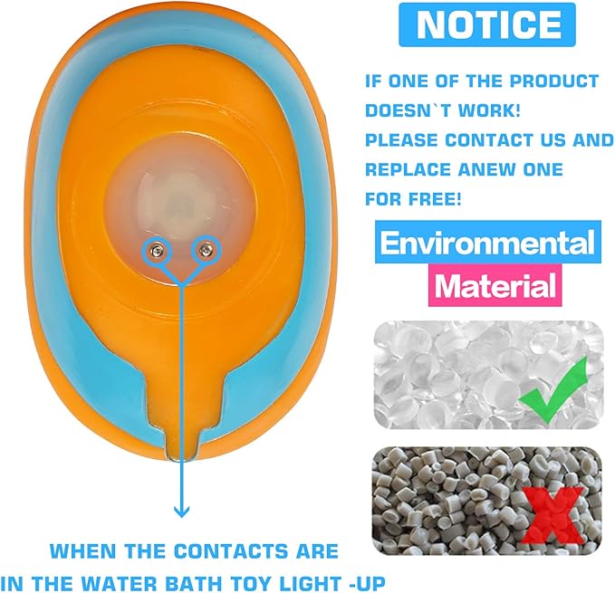 The light up bathtub toys are made of rubber that will float on water, there are 2 Sensors at the bottom, it will light up auto when put it on water, ideal gifts for baby playing in the bath room.