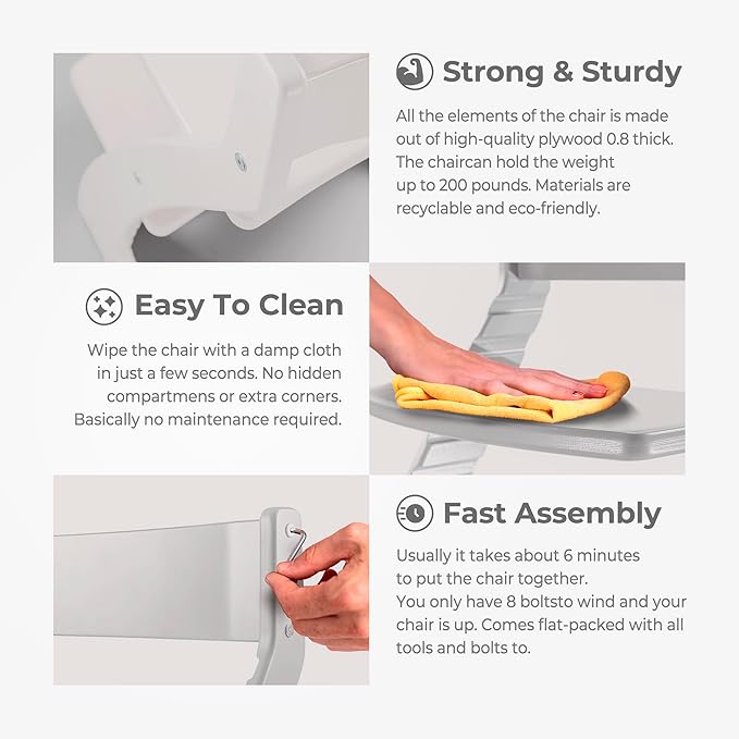 The toddlers chair has a very solid construction, with stable legs which makes it difficult to topple over; All Materials are FSC and CARBS certified, EPA TSCA Title VI compliant