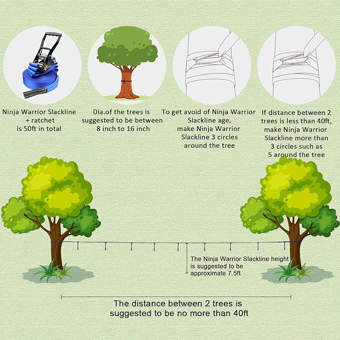 - [Upgraded Strength] - Upgraded Version Ninja Warrior Slackline. It's excellent safe ninja rope for kids outdoor play. Made of towing strap material, 150% thickness of regular slacklines, ensuring excellent firmness for long time use. Nothing is more important than that kids play in safety
