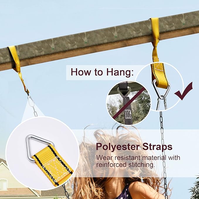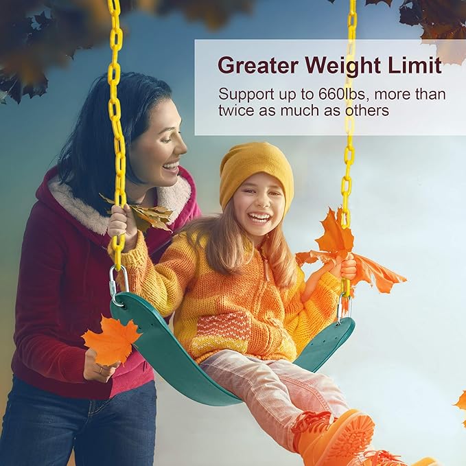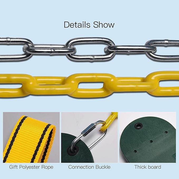 - 【Easy Installation & More Flexible Design】Our swing seats with chains provide extra locking buckles that are made of premium steel, which are steady and durable. The material solves the problem of rust on product surface. You can connect the buckle with the chain in the needed link, which makes the hanging installation more flexible. Unlike other kids swings' plastic plate connection buckle, our child swing seat connects with locking buckle that can easily take down for convenience.