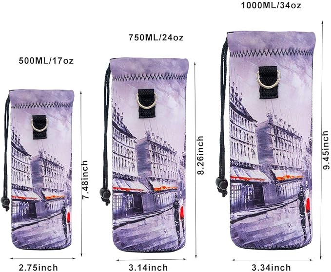 • Three Size for your choice: 500ML(16.9oz) water bottle bag,Length-7.48 inches,Diameter-2.75 inches;750ML(24oz) water bottle holder,Length-8.26 inches,Diameter-3.14 inches;1000ML(34oz) water bottle carrier,Length-9.45 inches,Diameter-3.34 inches.