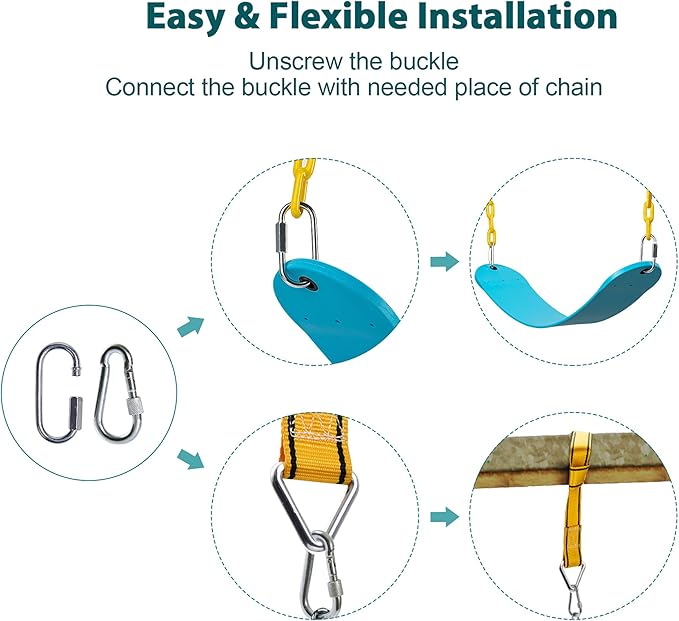 - 【Easy Installation & More Flesible Design】Our swing seats with chains provide extra locking buckles that are made of premium steel, which are steady and durable. The material solves the problem of rust on product surface. You can connect the buckle with the chain in the needed link, which makes the hanging installation more flexible. Unlike other kids swings' plastic plate connection buckle, our child swing seat connects with locking buckle that can easily take down for convenience.