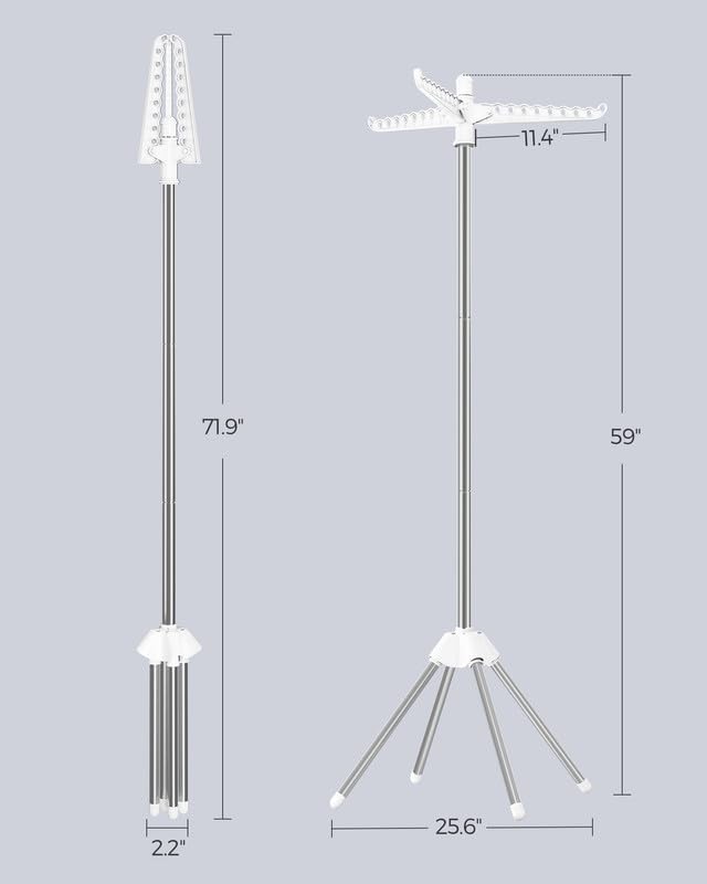 - [Foldable & Space-Saving] Standing at 25.6"D x 25.6"W x 59"H during use, this clothes drying rack takes up little space, perfect for small spaces. Fold the arms and legs into a small size of 2.2"D x 2.2"W x 71.9"H, it will stay out of the way after use