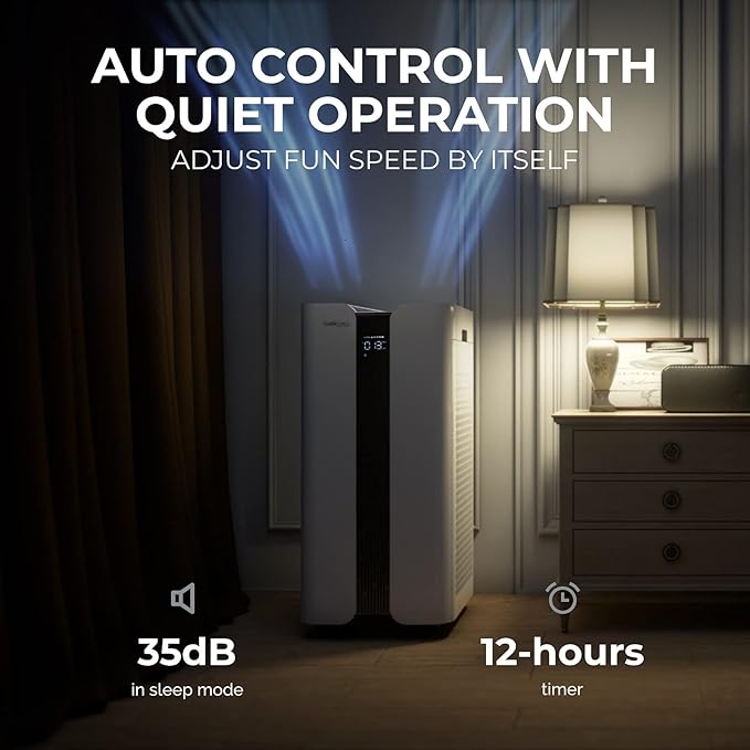 - ✅ SMART AUTO MODE&QUIET OPERATION: The smart air purifier will adjust its fan speed automatically based on your real-time air quality at the smart mode. Quiet enough to sleep even with such a large CADR - at just 35dB on the lowest setting. Quiet air purifier for bedroom,living room,office, classroom.