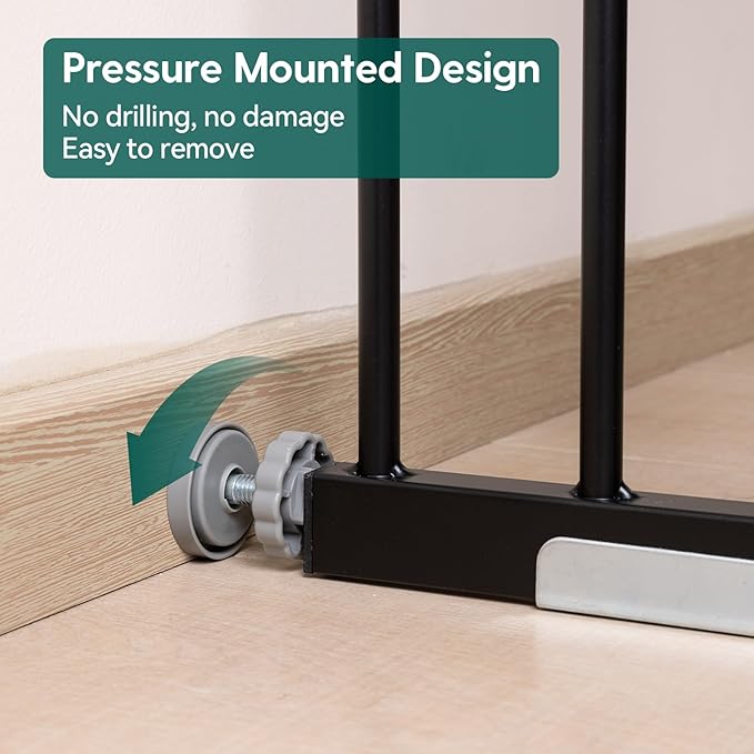 - QUICK & EASY INSTALL: Pressure mount design that is quick to set up. No additional tools are required for installation, and no need to punch holes in the wall. Please note, before installation there will be a gap between the gate latch and the frame which is NOT a defect and it is NOT bent. This gap will be eliminated once installed