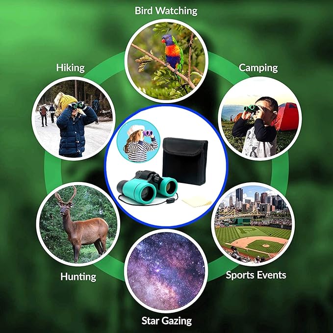 - Best Gift for Kds : Designed for kids binoculars,soft-rubber eyepiece protect the eys, so kids won't hurt their eyes.The compact kids binoculars can be folded to match eye to eye Distance Of Child.Great for bird watching, learning, hunting, theater, boat rides, hiking, traveling, and enjoying the wilderness! Explore the world with your kids!Perfect For The Children's Toy Or Educational Gifts