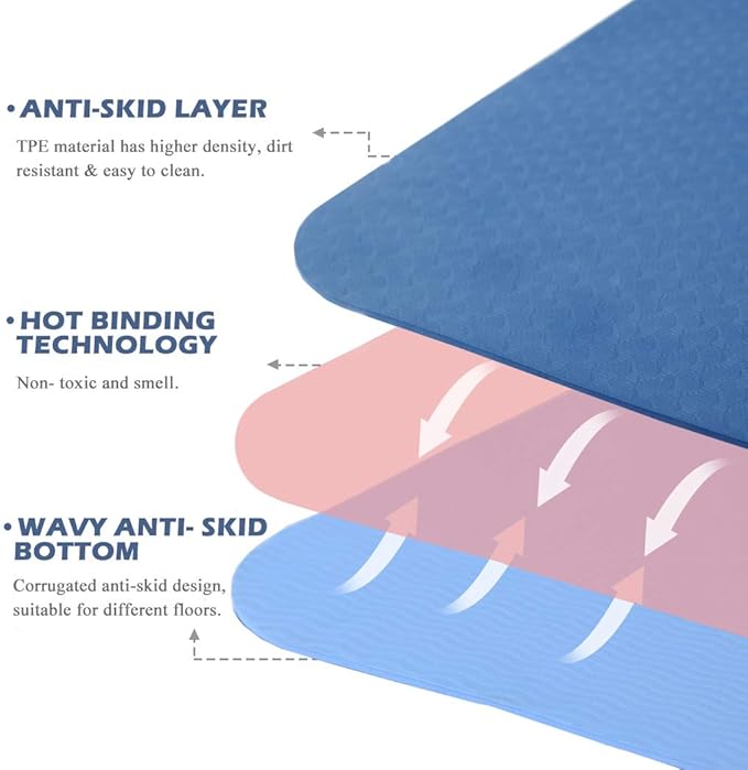 - DOUBLE NON-SLIP DESIGN - This workout mat has double-sided non-slip surfaces. Wavy undersides make excellent traction on the floor. It unrolls pretty flat and stays put. Special textured surface prevents your hands and feet from sliding when you sweat on it.