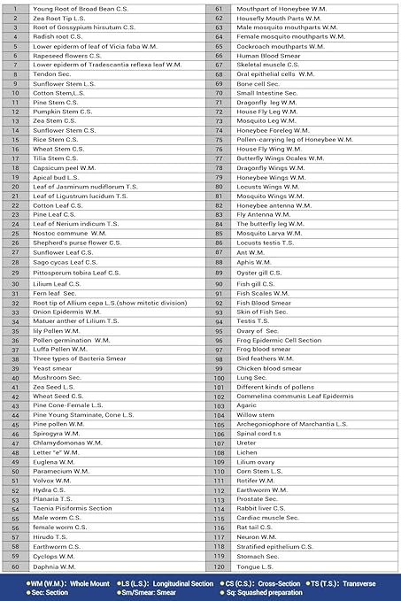 • Set of 120 prepared microscope slides, including plants, insects, and animal tissues, for use in biological education